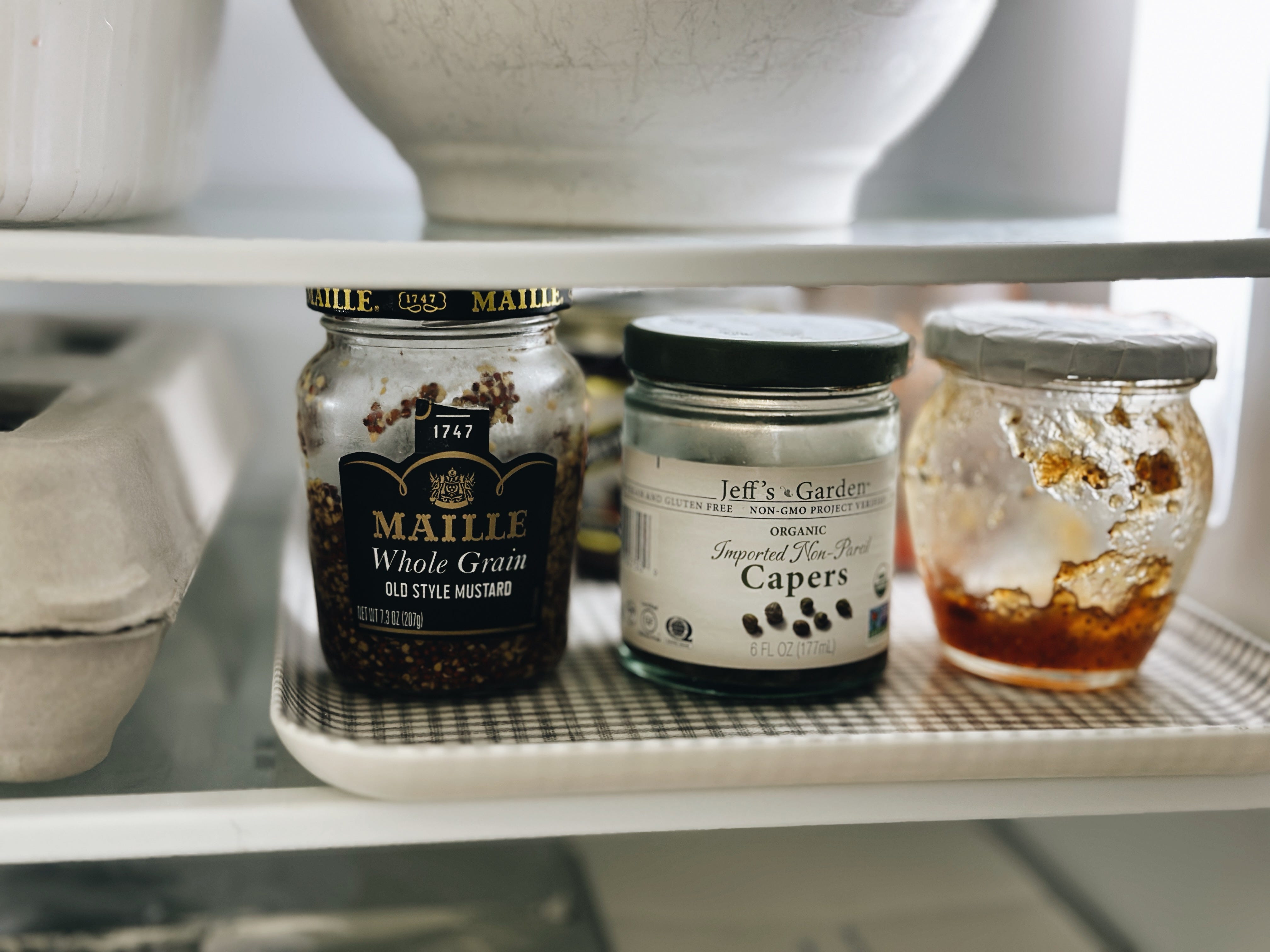 Once you see, you’ll recognize all the places you can put a tray-drawer. Even in the refrigerator, on the shelf that’s got space just high enough for a carton of eggs. Turns out it’s also just high enough for a tray coralling all the short jars: jam, capers, mustards, bouillon, leaving the fridge door shelves for the tall bottles and jars.