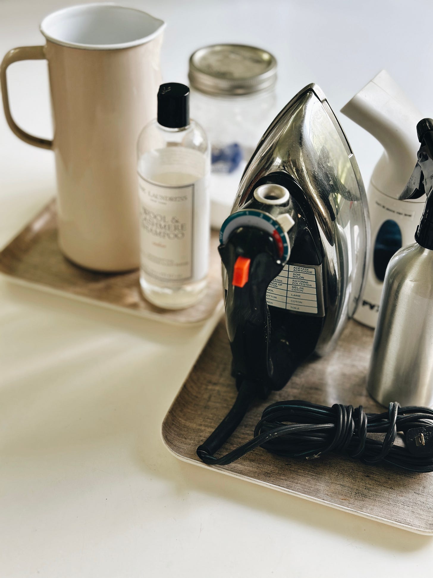 On one tray, I had what you see in the top photo above: an enameled pitcher with decanted bulk powdered laundry detergent and a right-size measuring spoon inside, a bottle of wool shampoo, a jar of fabric brightner, and, out of sight in the photo, a stain bar. The other tray held ironing essentials: my iron, travel steamer, and a water spray bottle. And the trays themselves? Made of 100% linen, coated with a food-grade poly-resin. Beauty and function, served.